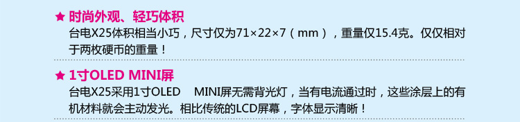 台电X25体积相当小巧,尺寸仅为71×22×7(mm),重量仅15.4克。仅仅相对于两枚硬币的重量。你可以非常方便的将X25放在钱包里或者口袋里携带。台电X25外壳采用特殊的"真空彩色电镀工艺",炫彩艳丽!永不褪色!