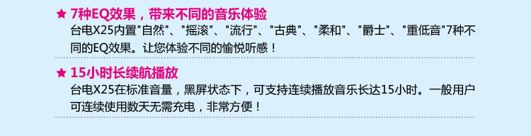 台电X25内置"自然"、"摇滚"、"流行"、"古典"、"柔和"、"爵士"、"重低音ś种不同的EQ效果。您可以根据自己的偏好或者音乐的类型进行多种搭配。体验不同的愉悦听感。