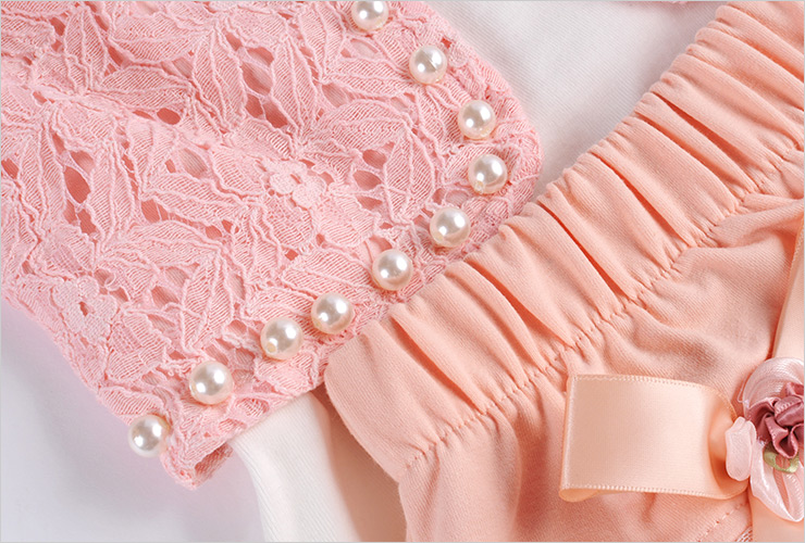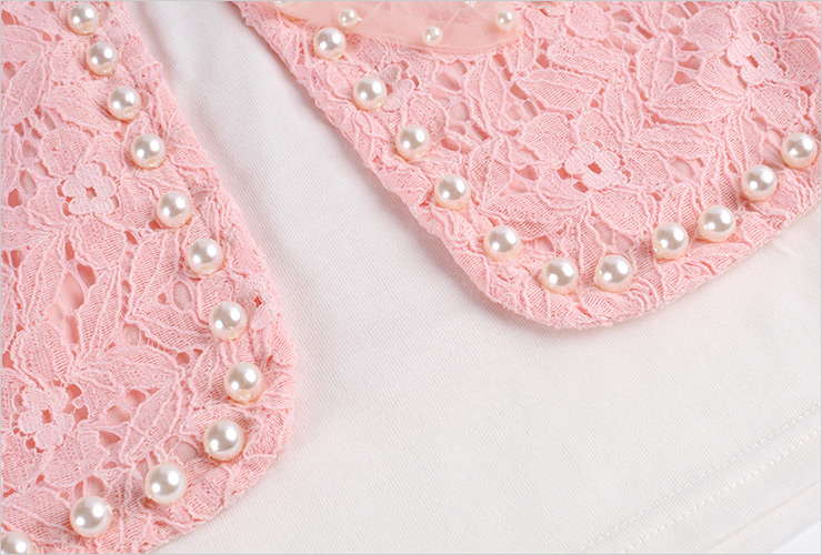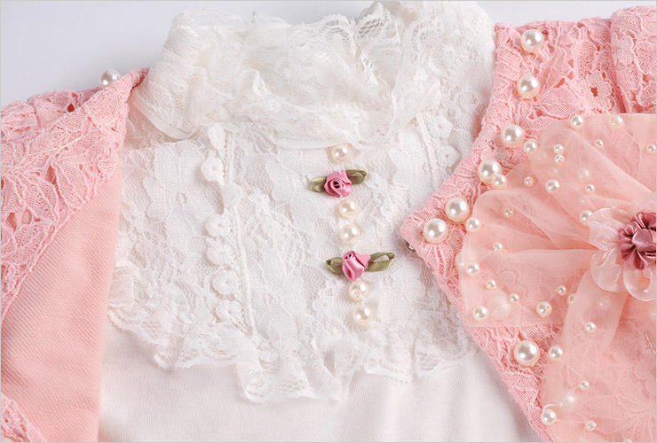 打底衫的领口也采用了蕾丝+手工缝珠设计,让衣衣倍显气质
