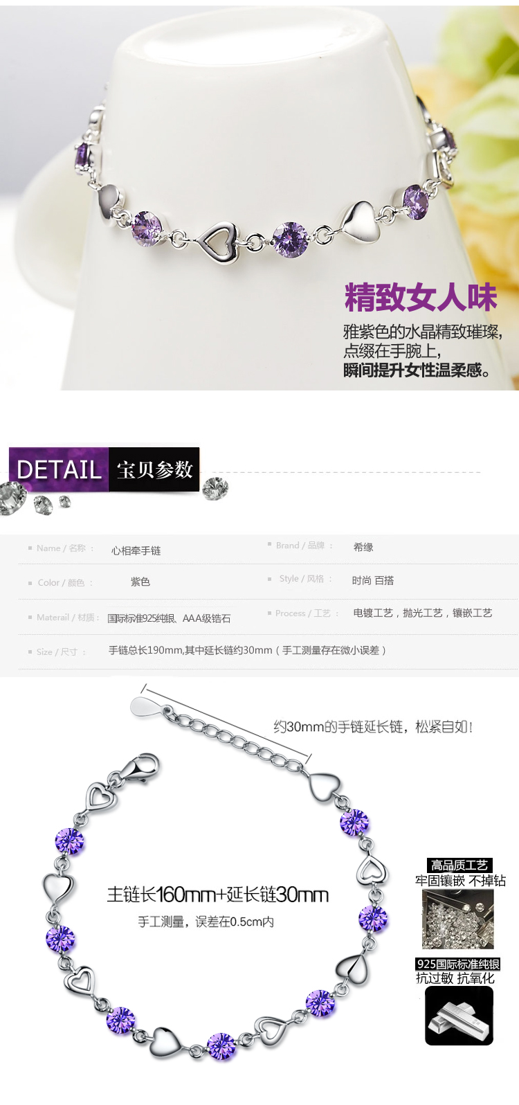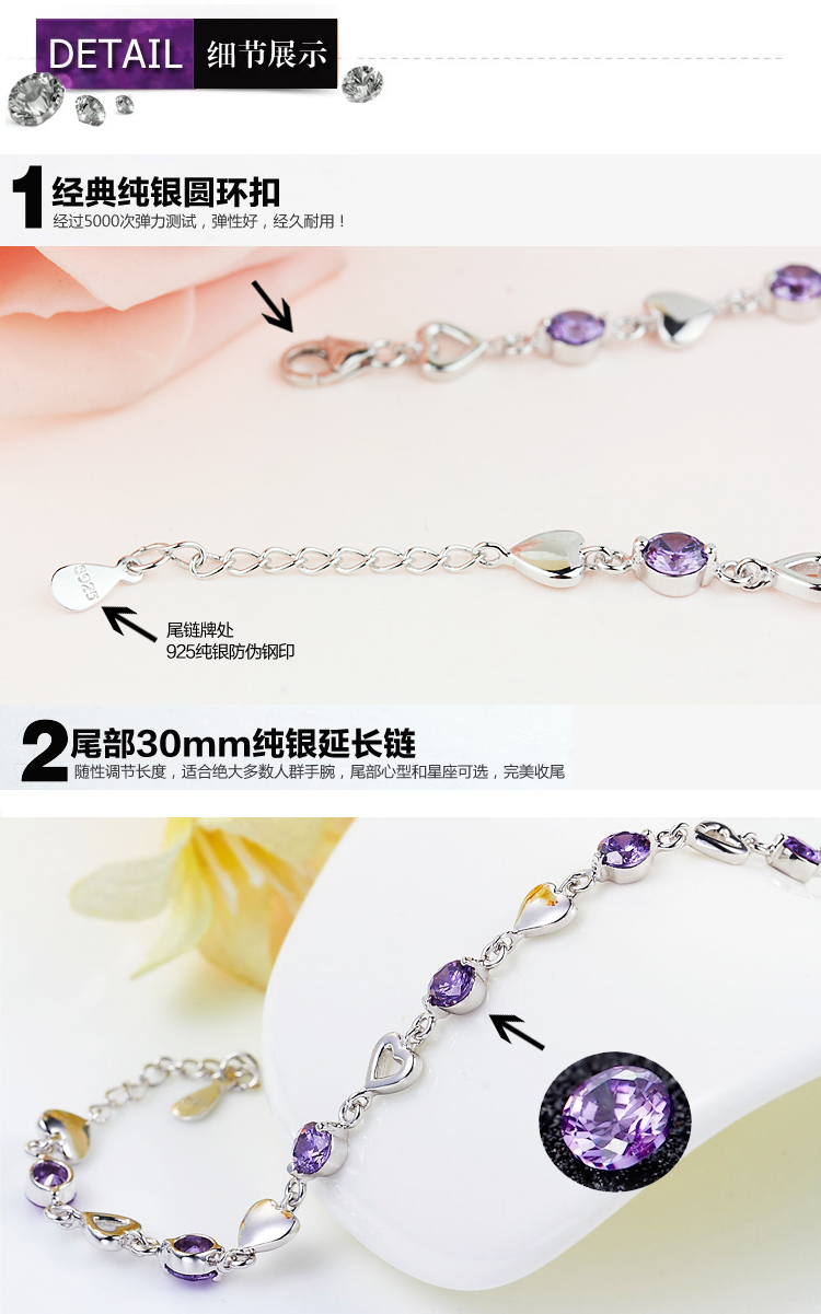 商品名称:希缘 925纯银手链女款 紫水晶心形手连...商品编号:1188011458店铺:希缘珠宝旗舰店上架时间:2014-06-19 13:07:10商品毛重:60.00g商品产地:中国大陆风格:日韩类别:手链材质:纯银
