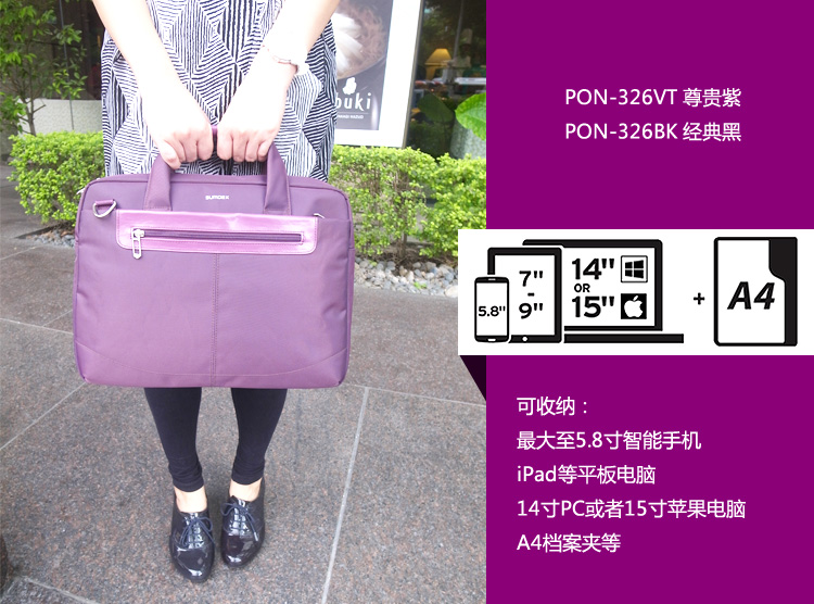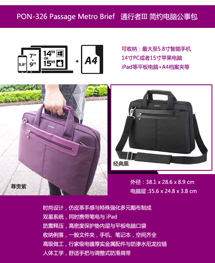 积分兑换 >> 美国森泰斯(Sumdex) PON-326VT 14寸+iPad悬空保护商务单肩手提电脑包紫色